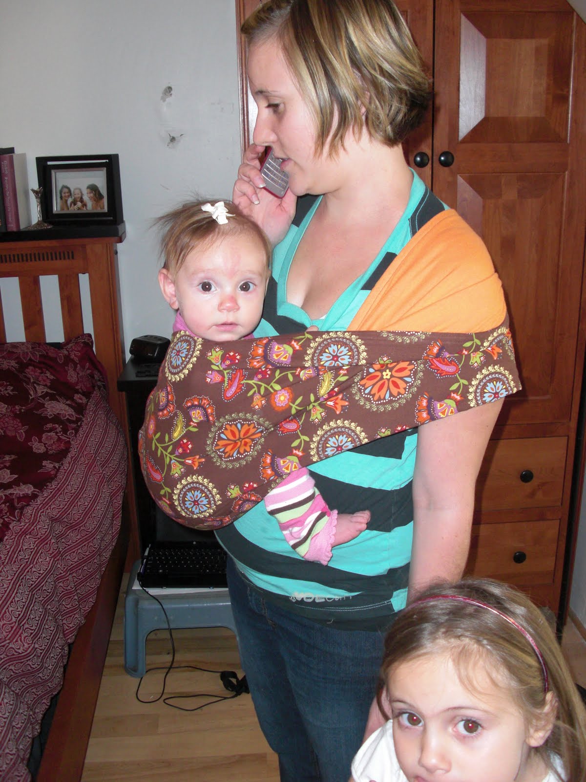 This is a really simple baby sling that I made for my sister. It is reversible because we used a flat-felled seam so it is exactly the same on both sides. We used orange as the solid so that she could wear my niece as a pumpkin for Halloween since she had already bought an orange pumpkin hat.